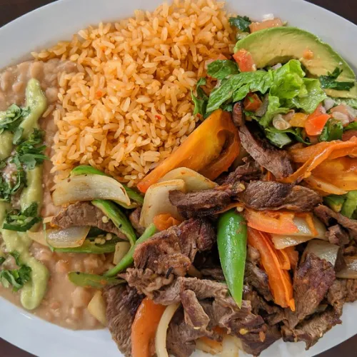 Thinly sliced steak marinated and cooked with onions, creating a tender and flavorful dish. Served with rice and beans, this traditional Mexican comfort food offers a hearty and satisfying meal.